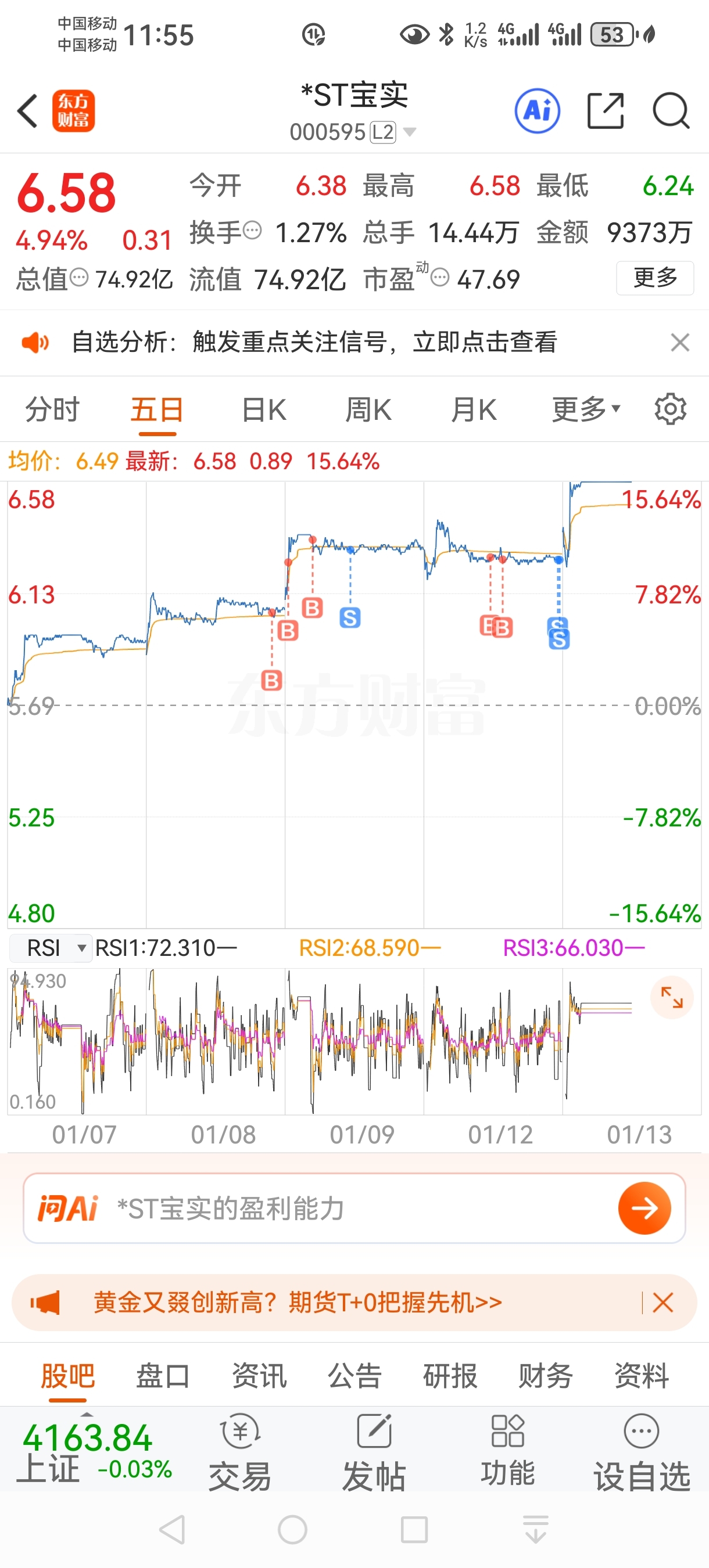 $*ST宝实(SZ000595)$ 昨天高开没出水下又补仓尾盘不该出了一半