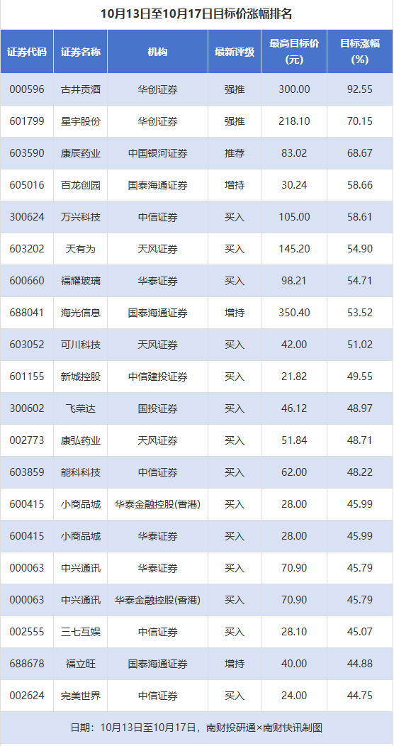 南财投研通数据显示,10月13日至10月17日,券商给予上市公司目标价共81次,按最新收盘价计算,目标价涨幅排名居前的公司有古井贡酒、星宇股份、康辰药业,目标价涨幅分别为92.55%、70.15%、68.67%,分别属于白酒、汽车零部件、生物制品行业。