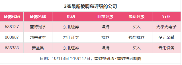 评级调高方面,10月13日至10月17日,券商调高上市公司评级有3家次,最新数据包括了东北证券对蓝特光学、新益昌的评级从“增持”调高至“买入”,方正证券对越秀资本的评级从“推荐”调高至“强烈推荐”。