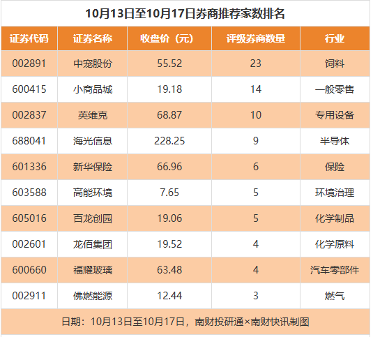 从券商推荐家数来看,10月13日至10月17日有197家上市公司得到券商推荐,其中中宠股份获得23家推荐,小商品城获得14家推荐,英维克获得10家推荐。