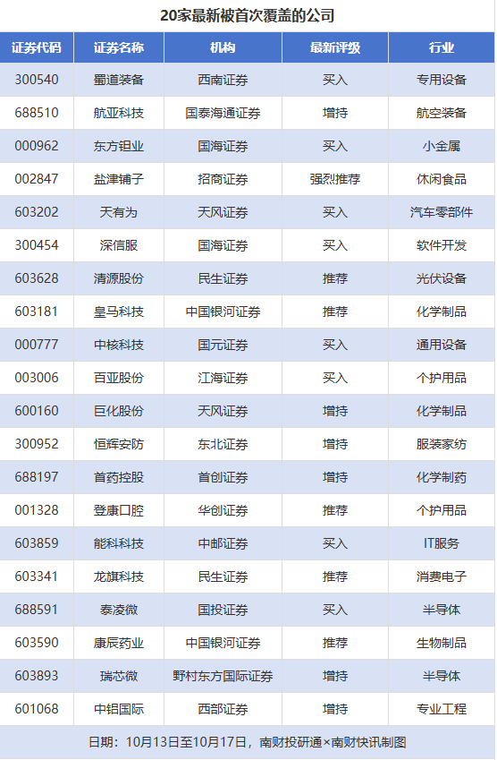 首次覆盖方面,10月13日至10月17日券商共给出了55次首次覆盖,其中蜀道装备获得西南证券给予“买入”评级,航亚科技获得国泰海通证券给予“增持”评级,东方钽业获得国海证券给予“买入”评级,盐津铺子获得招商证券给予“强烈推荐”评级,天有为获得天风证券给予“买入”评级。