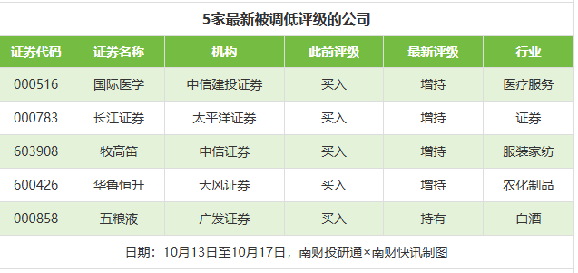 评级调低方面,10月13日至10月17日,券商调低上市公司评级为5家次,最新数据包括了中信建投证券对国际医学的评级从“买入”调低至“增持”,太平洋证券对长江证券的评级从“买入”调低至“增持”,中信证券对牧高笛的评级从“买入”调低至“增持”。