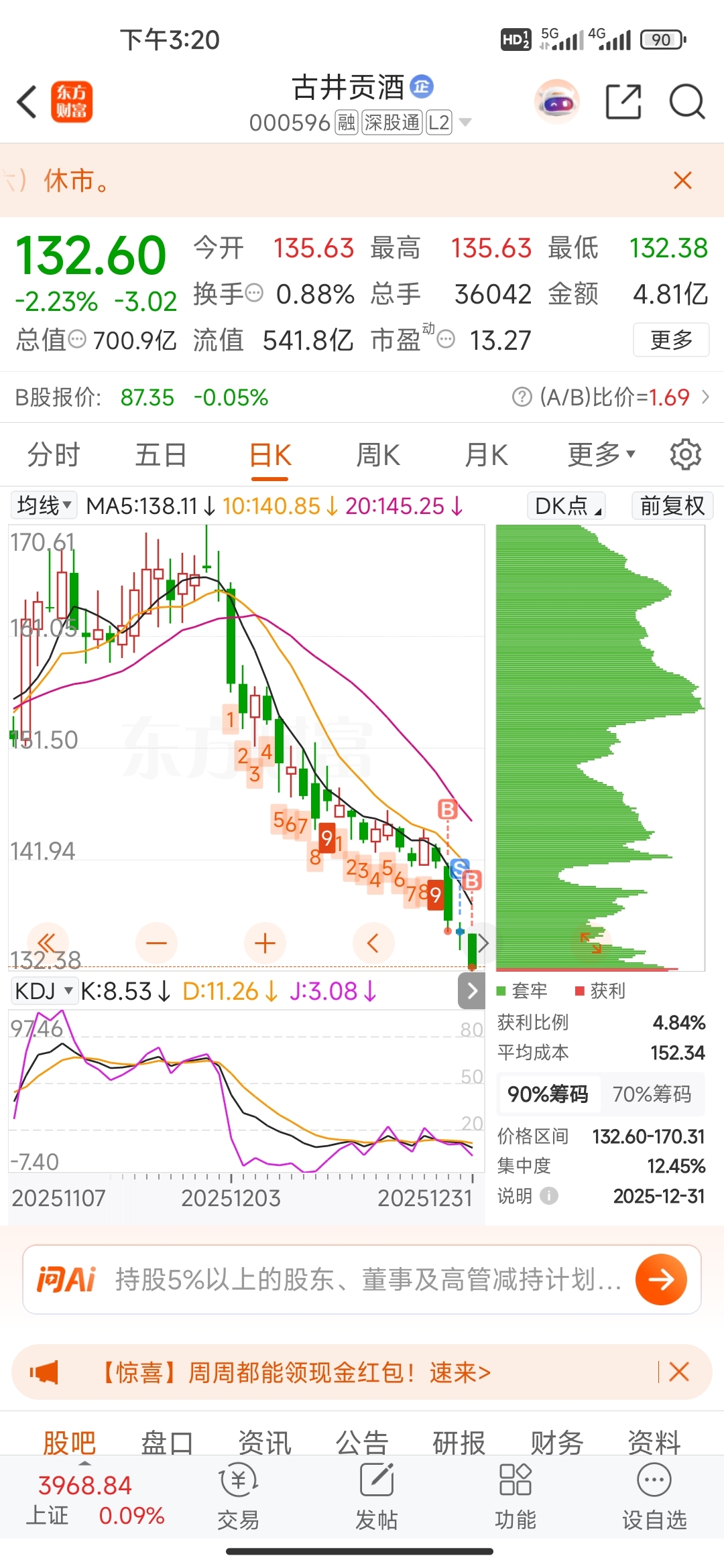 前天抄底,昨天看情况不对,割肉,今天尾盘又杀回来了,一个月跌20个点,还是这样的大盘股,实在难以理解,关键前期也没怎么涨,元旦后大盘调整,这些超跌的票应该跌的少一点,先买一点吧,跌破130元止损。
