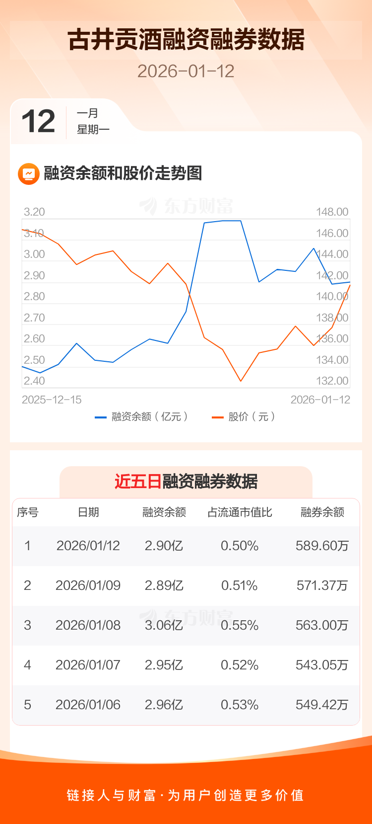 交易所最新数据显示,古井贡酒于2026年1月12日获融资买入4784.41万元,融资偿还4629.85万元,当日融资净买入154.56万元。目前,该股融资余额2.90亿,占流通市值比例为0.50%。