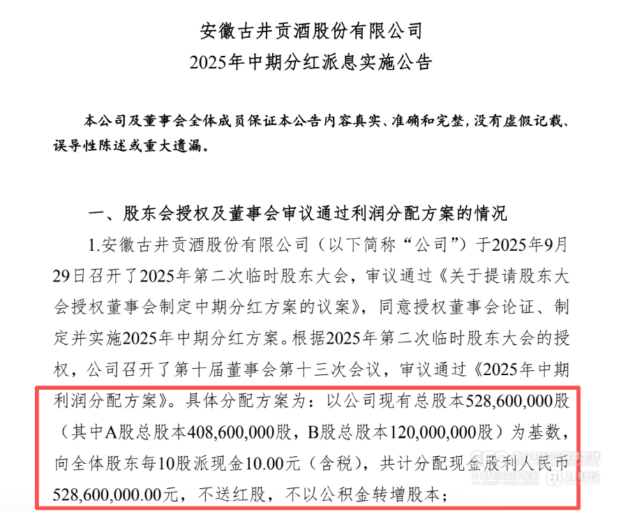 2月1日下午,古井贡酒披露了2025年中期派息实施报告,以公司现有总股本5.286亿股为基数,向全体股东每10股派10元人民币现金,共计5.286亿元。