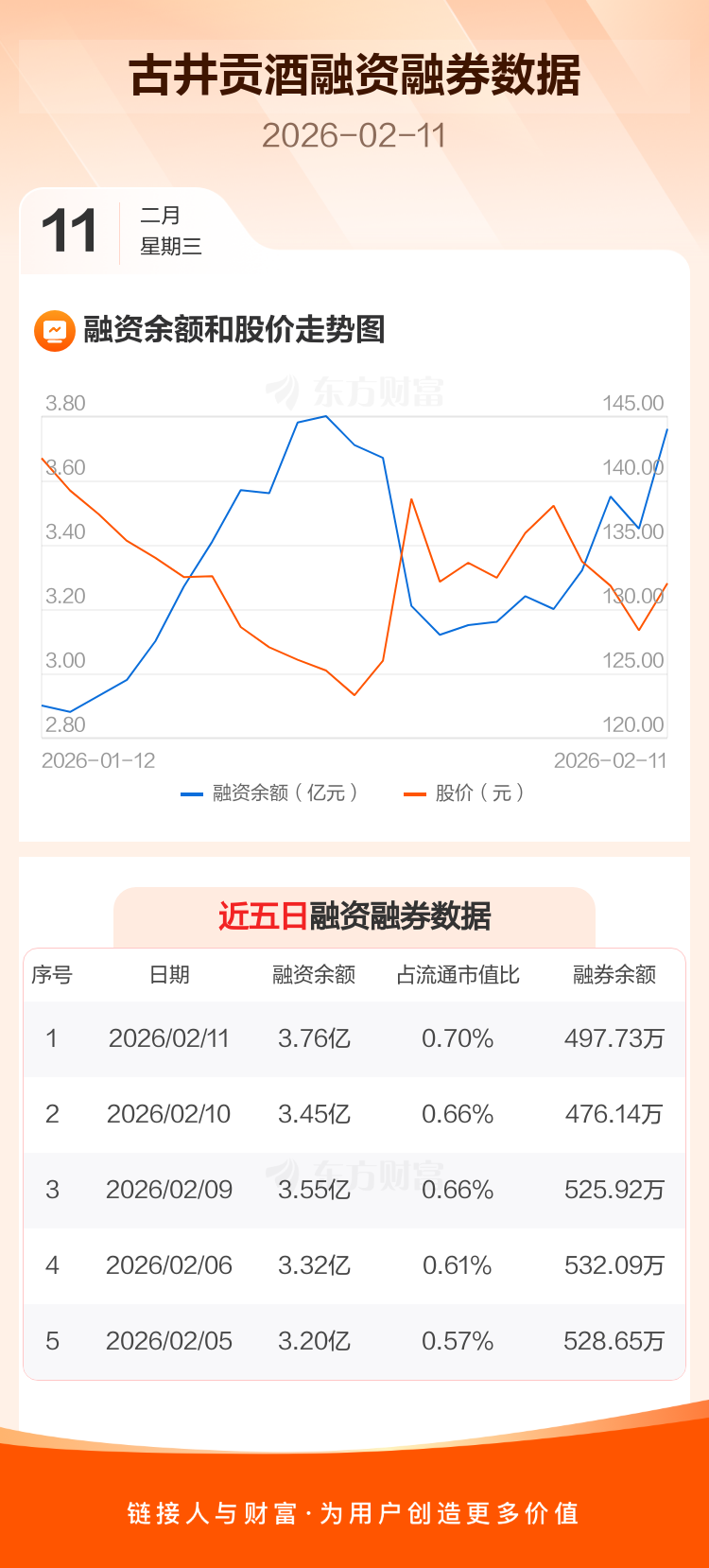 交易所最新数据显示,古井贡酒于2026年2月11日获融资买入6951.21万元,融资偿还3799.19万元,当日融资净买入3152.02万元。目前,该股融资余额3.76亿,占流通市值比例为0.70%。