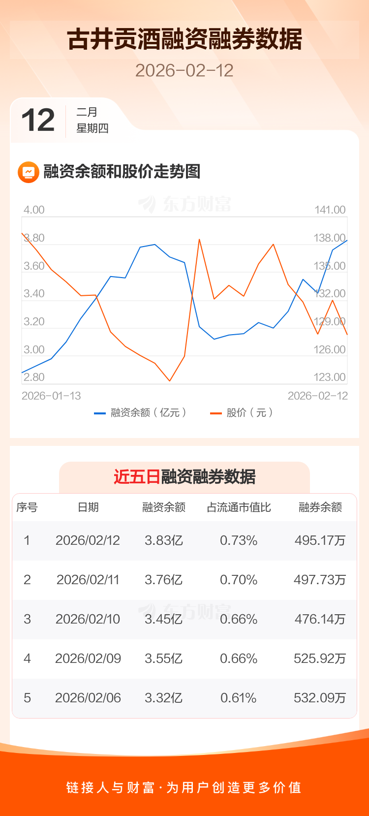 交易所最新数据显示,古井贡酒于2026年2月12日获融资买入3574.06万元,融资偿还2885.93万元,当日融资净买入688.13万元。目前,该股融资余额3.83亿,占流通市值比例为0.73%。