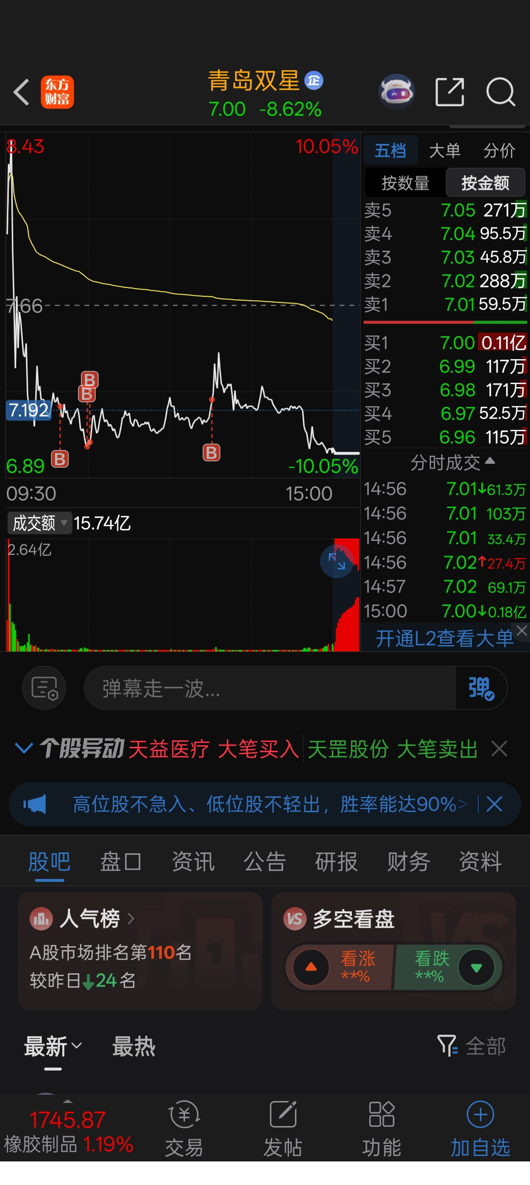$青岛双星(SZ000599)$  大低开就拿到收盘,平开开盘就先清半仓,不涨就清仓,小盘股连板几乎回调都是A,辛亏只用了百分之一的仓位