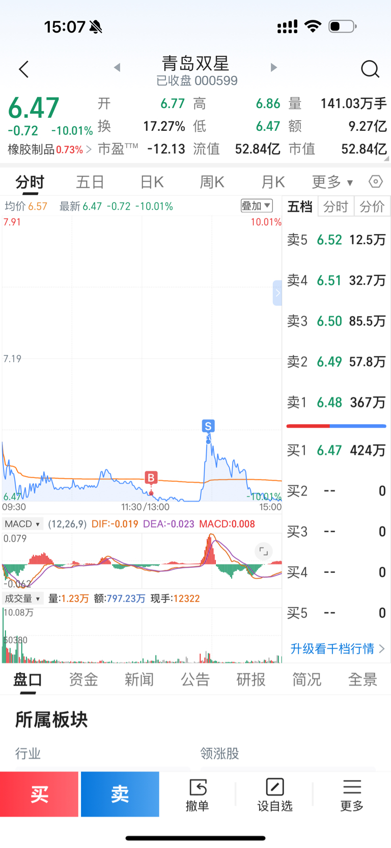 $青岛双星(SZ000599)$  这两天进场的 成本价6.45