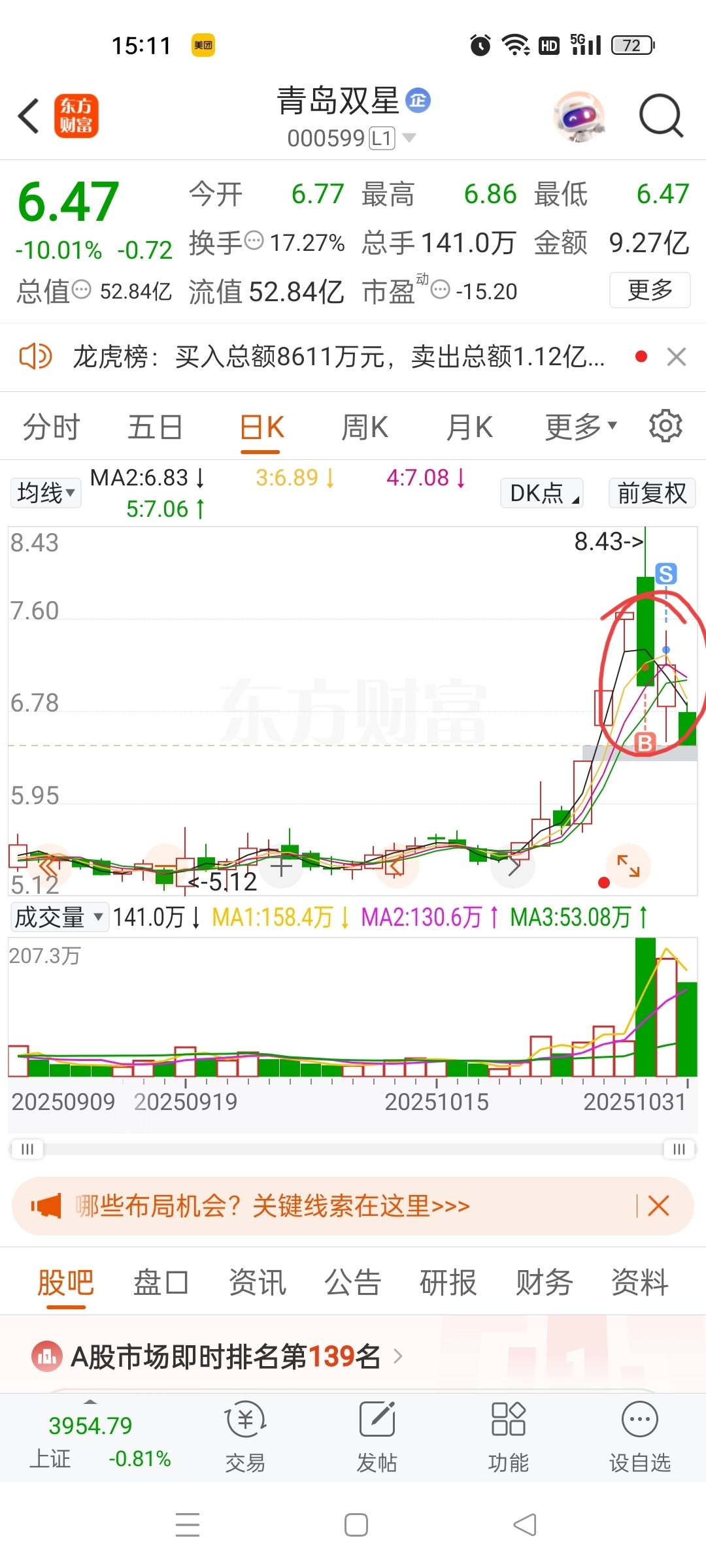 $青岛双星(SZ000599)$ 有这个空头阳线不可能起来,起码要下面出现大于这个换手的再看