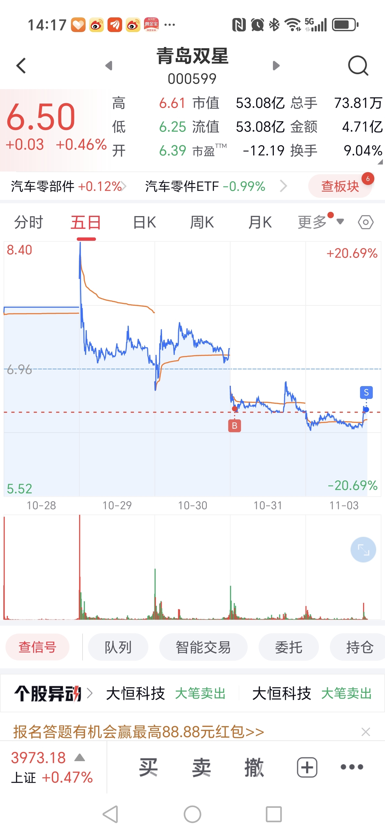 $青岛双星(SZ000599)$ 周五跌停买的,赚三分钱走了。感谢助力不杀之恩。