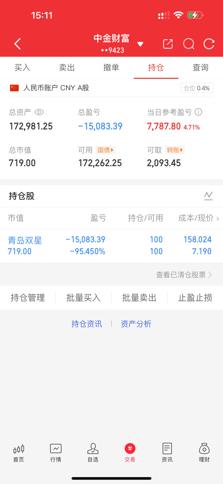 五万实盘的第102天(10月30日),不到五百万,不停更。记录个人成长,验证个人实力,欢迎打假,绝对实盘。目前172981元。$青岛双星(SZ000599)$ 在涨差不多五个点的时候卖出,大亏七点多出来。我想提醒一下,我只是记录我自已的操作,不做任何投资建议。任何投资都有风险,如果对我有意见的,请别关注我。我留一手,记录我昨晚被骂的经历。#收盘点评# #复盘记录# #强势机会# #实盘记录# #炒股日记#