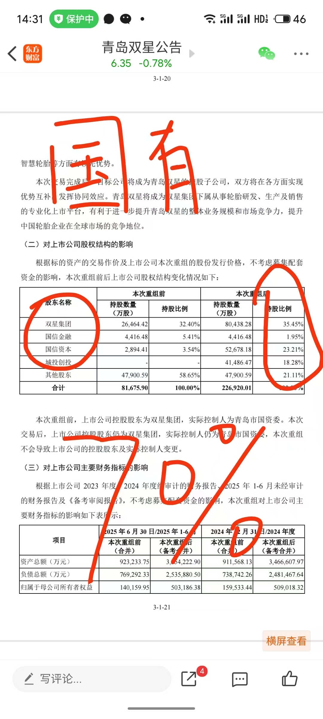 $青岛双星(SZ000599)$ 如果重组成功,国有占比超过77%,但是新增加的他们的成本价只有3块多,就看青岛国资会不会轻易减持,目前流通的的和重组成功以后的流通股不会有啥变化,那些梦想翻倍的很难的 还有一个8亿的,总股本会继续增加1.5亿股左右,要等重组成功以后才会进行,具体如何现在不清楚 今天跌成这样,确实应该是股价还是相对来说高了,有资金的后面慢慢补仓吧