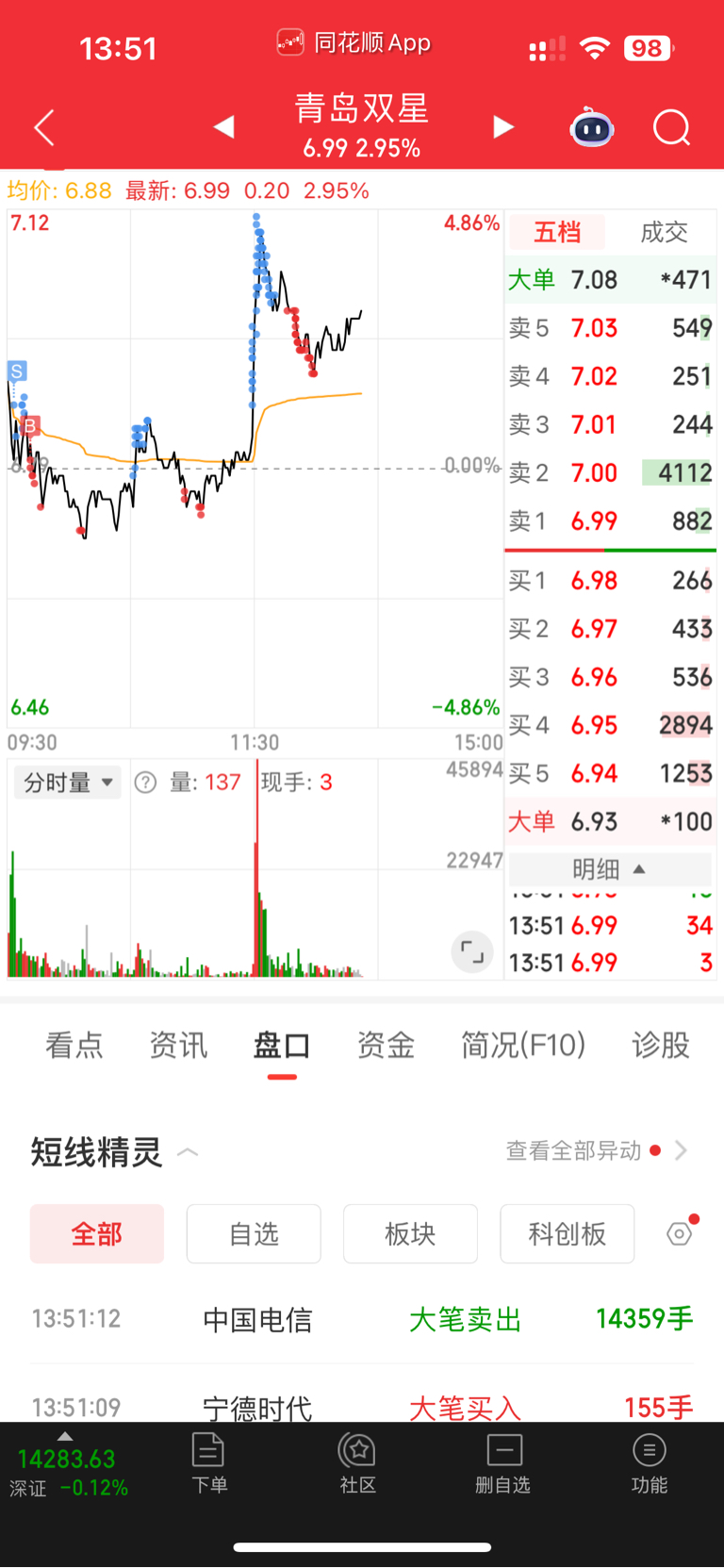 $青岛双星(SZ000599)$ 今天在青岛双星做了126笔交易,成功赚了一碗鸭血粉丝汤。