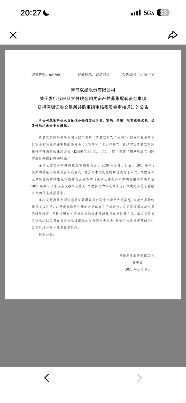$青岛双星(SZ000599)$ 恭喜重组通过,因为没通过早就公告了,没有必要拖,重组标标的大:锦湖轮胎,营收250亿,利润20亿。预计明晚公告,十个涨停,典型的蛇吞象
