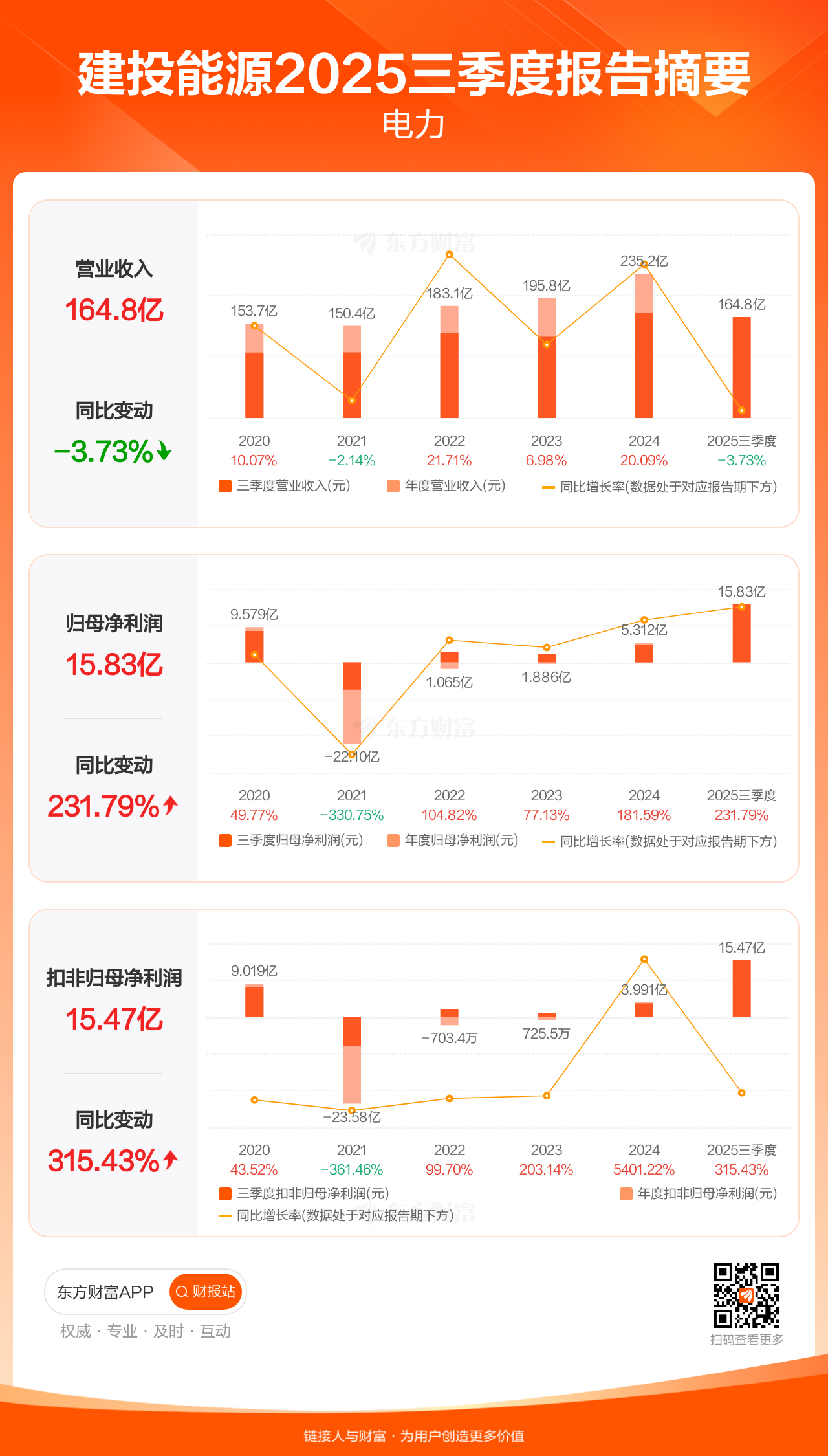建投能源10月31日发布2025年三季报显示,公司前三季实现营业收入164.82亿元,同比下滑3.73%;归母净利润15.83亿元,同比增长231.79%;扣非归母净利润15.47亿元,同比增长315.43%。