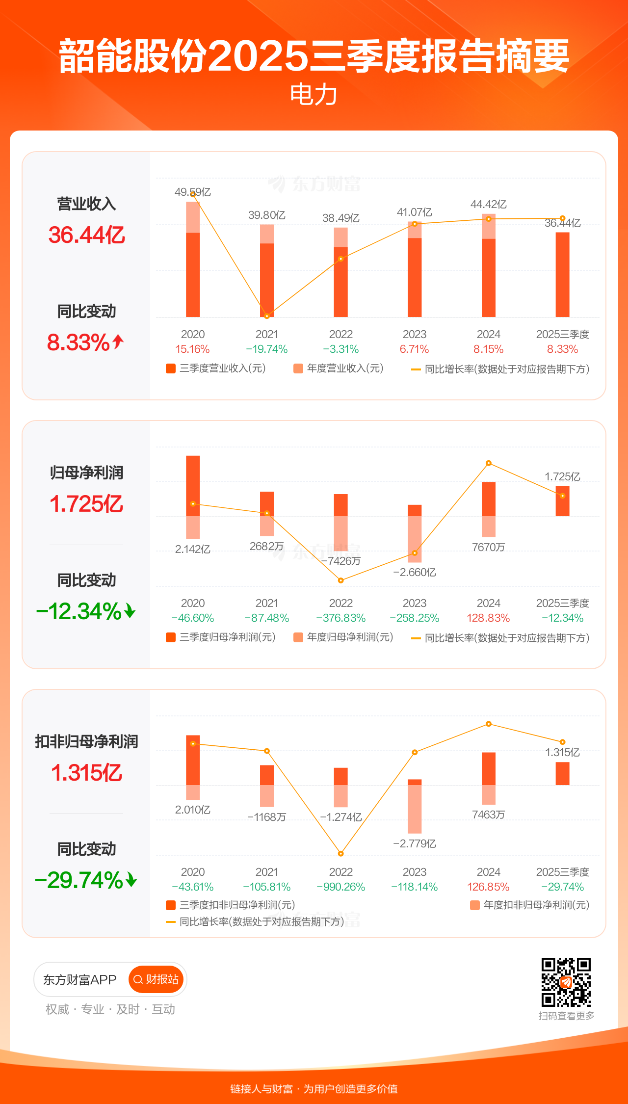 韶能股份10月30日发布2025年三季报显示,公司前三季实现营业收入36.44亿元,同比增长8.33%;归母净利润1.73亿元,同比下滑12.34%;扣非归母净利润1.32亿元,同比下滑29.74%。