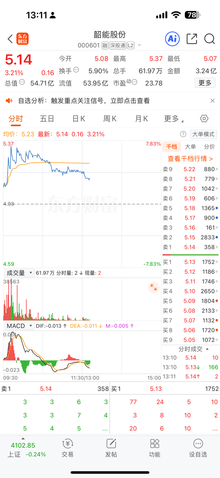 $韶能股份(SZ000601)$ 现在买点应该安全点,早上六七个点抢着买,现在抢着卖,