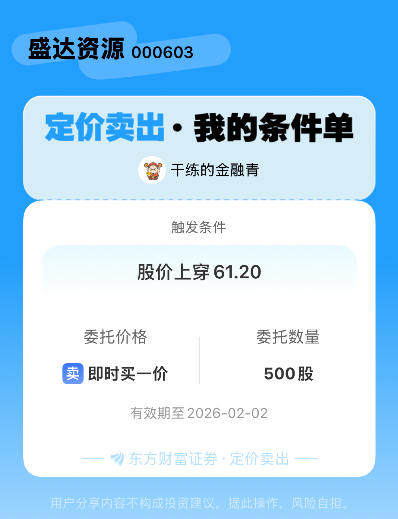 #条件单交流# #定价卖出晒单# 一位股神设置了一个定价卖出条件单,接下来就是见证奇迹的时刻~$盛达资源(SZ000603)$