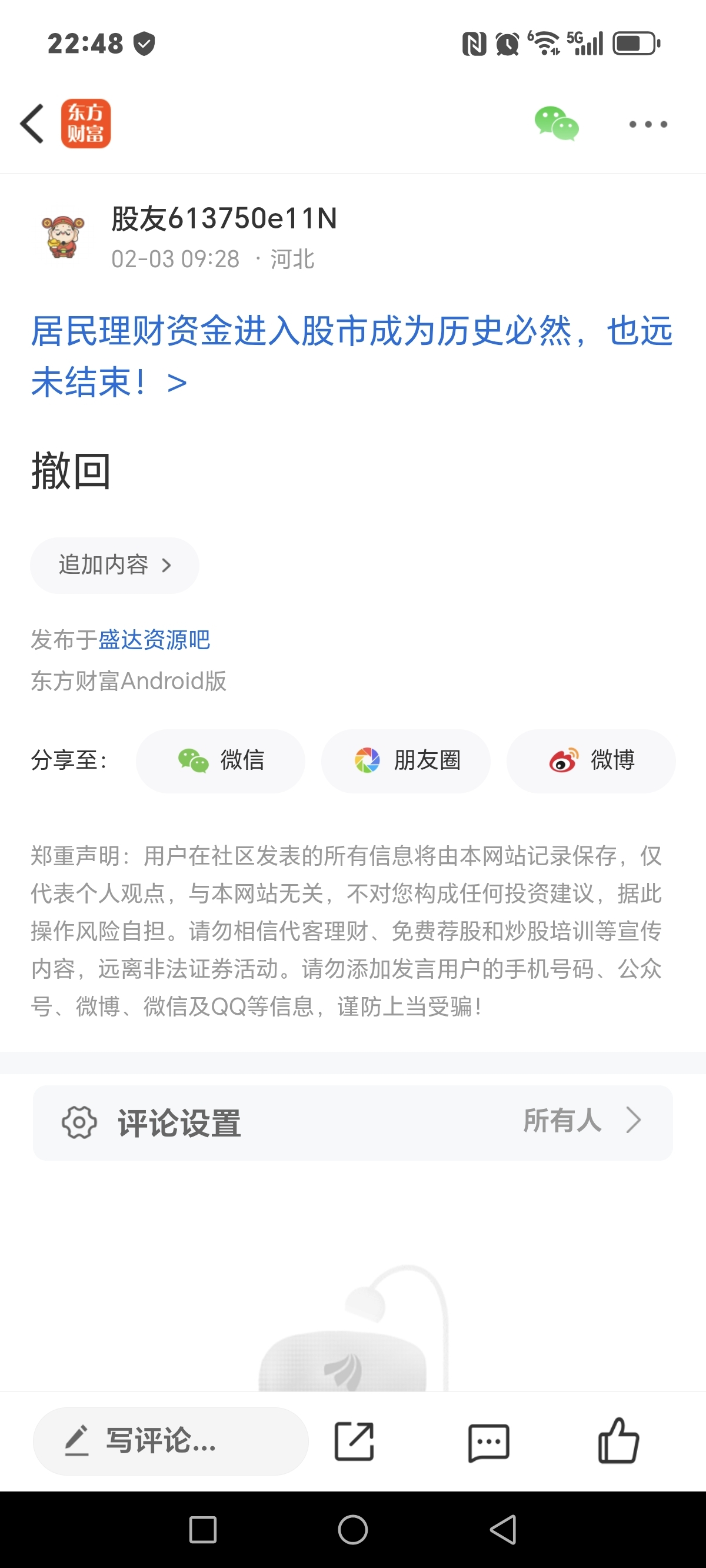 温馨提示: 1.根据《证券法》规定,禁止编造、传播虚假信息或者误导性信息,扰乱证券市场;2.用户在本社区发表的所有资料、言论等仅代表个人观点,与本网站立场无关,不对您构成任何投资建议。用户应基于自己的独立判断,自行决定证券投资并承担相应风险。《东方财富社区管理规定》