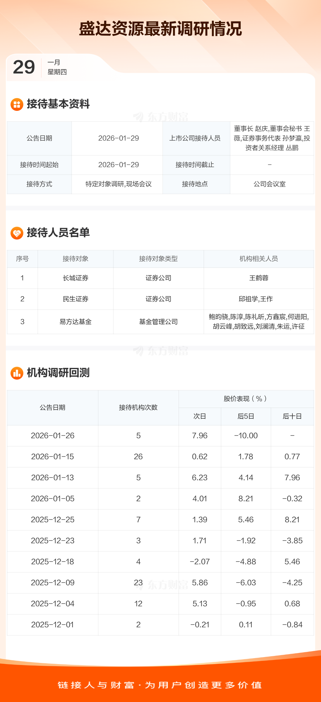 盛达资源1月29日公告称,1月29日接待长城证券等3家机构调研。接待人员包括董事长 赵庆,董事会秘书 王薇,证券事务代表 孙梦瀛,投资者关系经理 丛鹏。