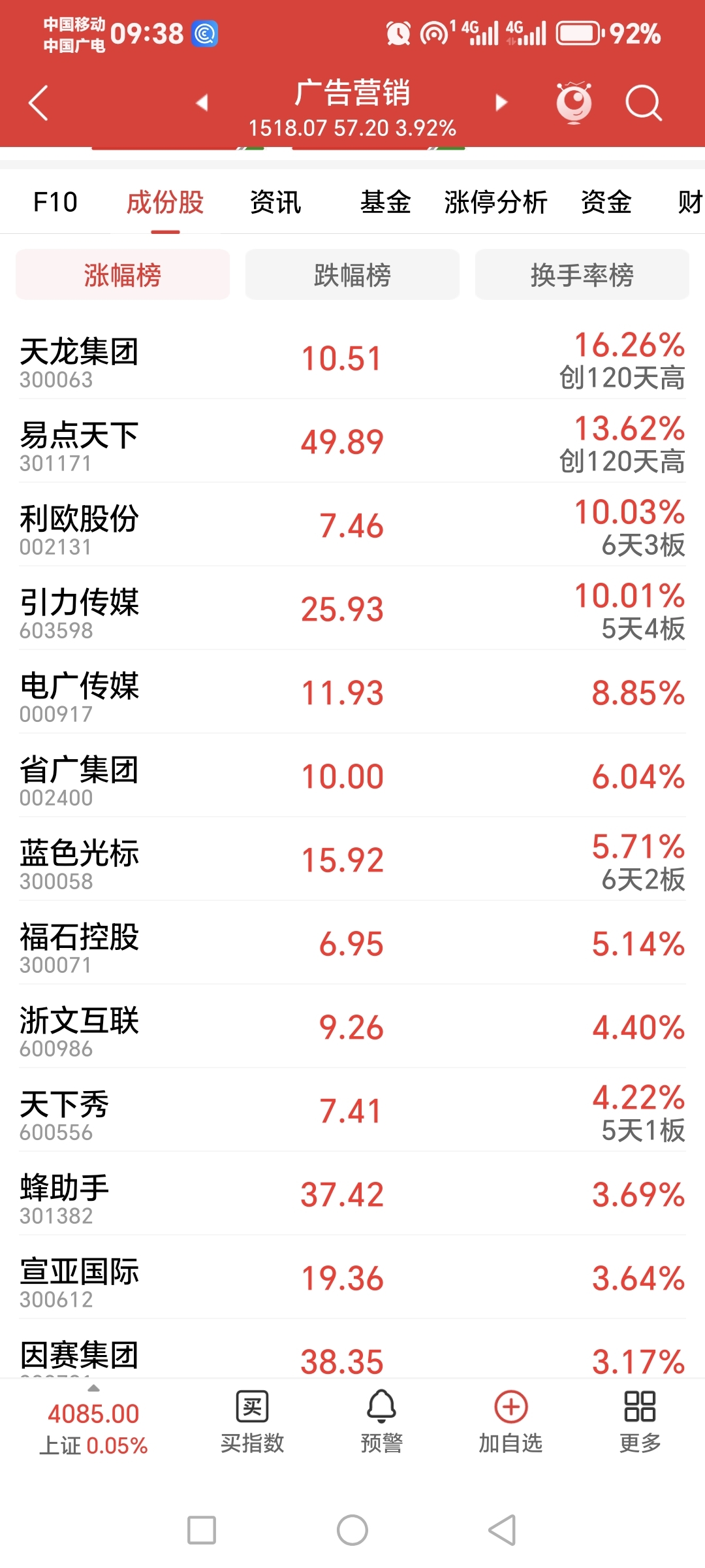 广告营销板块涨疯了最近,龙一引力传媒。中军利欧股份,蓝色光标。挖掘低位补涨是哪个