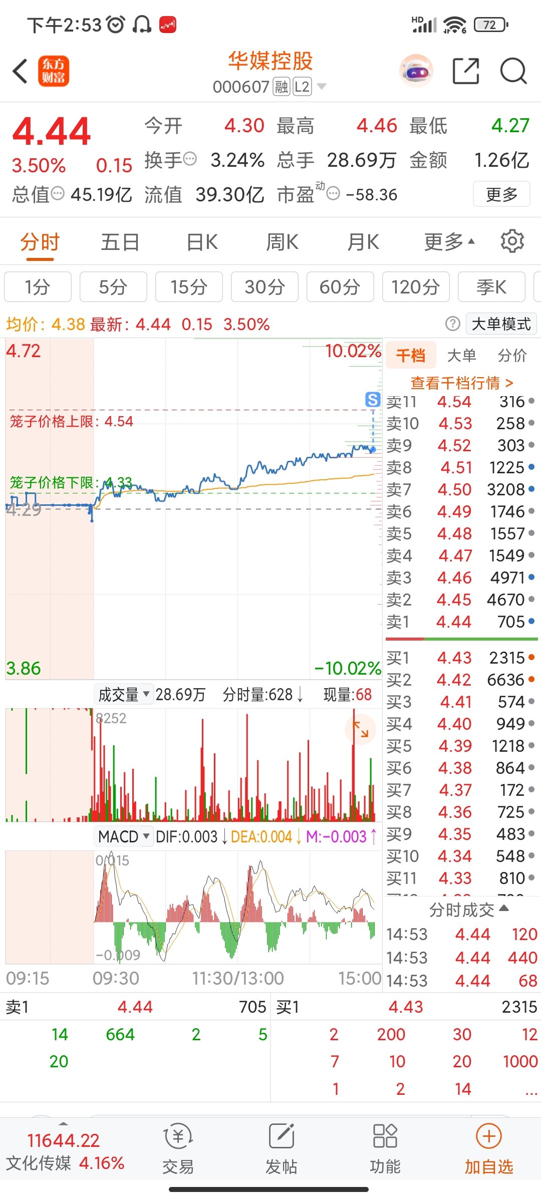 $华媒控股(SZ000607)$ 掰掰了,4.5都不能到,太弱了,4本
