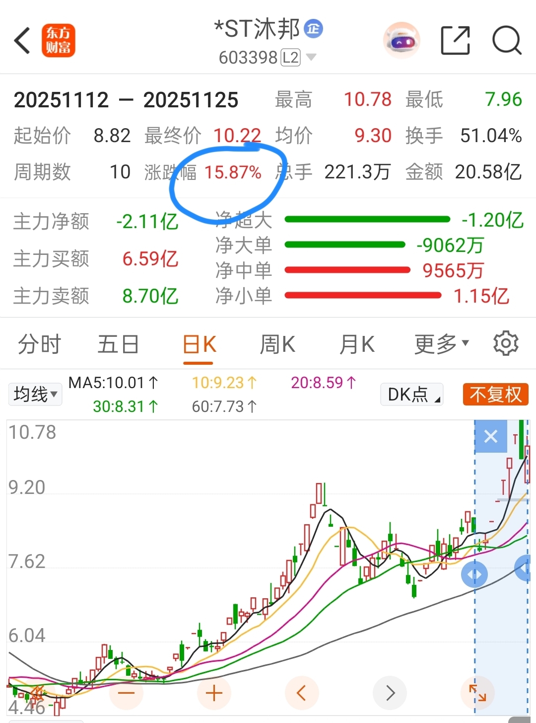 沐邦和亚振同样是25日监管到期,亚振监管期间跌了5.7%,沐邦监管期间涨了15.87%,但是沐邦出来了,这说明什么?这代表了交易所的态度,认为目前这个阶段沐邦的安全性较高,不适合监管了。这是很明显的信号呀。$*ST沐邦(SH603398)$ $ST中迪(SZ000609)$ $*ST东易(SZ002713)$