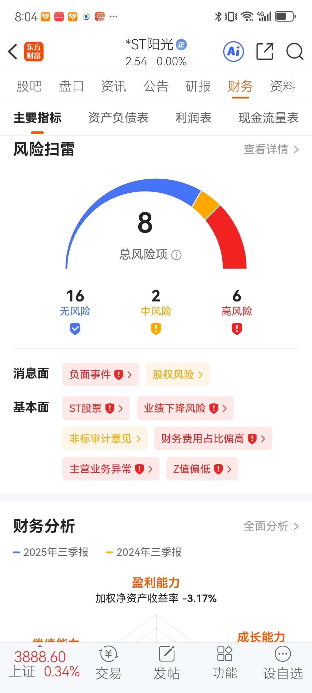 $*ST阳光(SZ000608)$ 大家看看吧,这么多风险,财务费用过高,意味着企业有借款,借款利息高是导致财务费用过高的主要原因,当借款利息高于企业银行账户的存款利息,就会显示财务费用过高。
