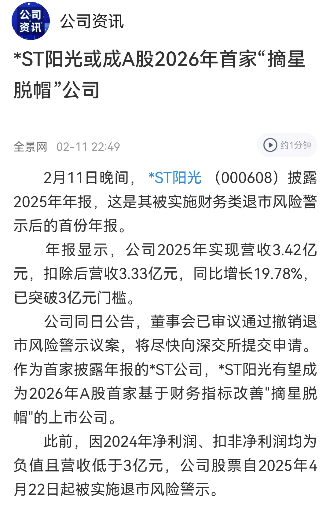 *ST阳光或成A股2026年首家“摘星脱帽”公司