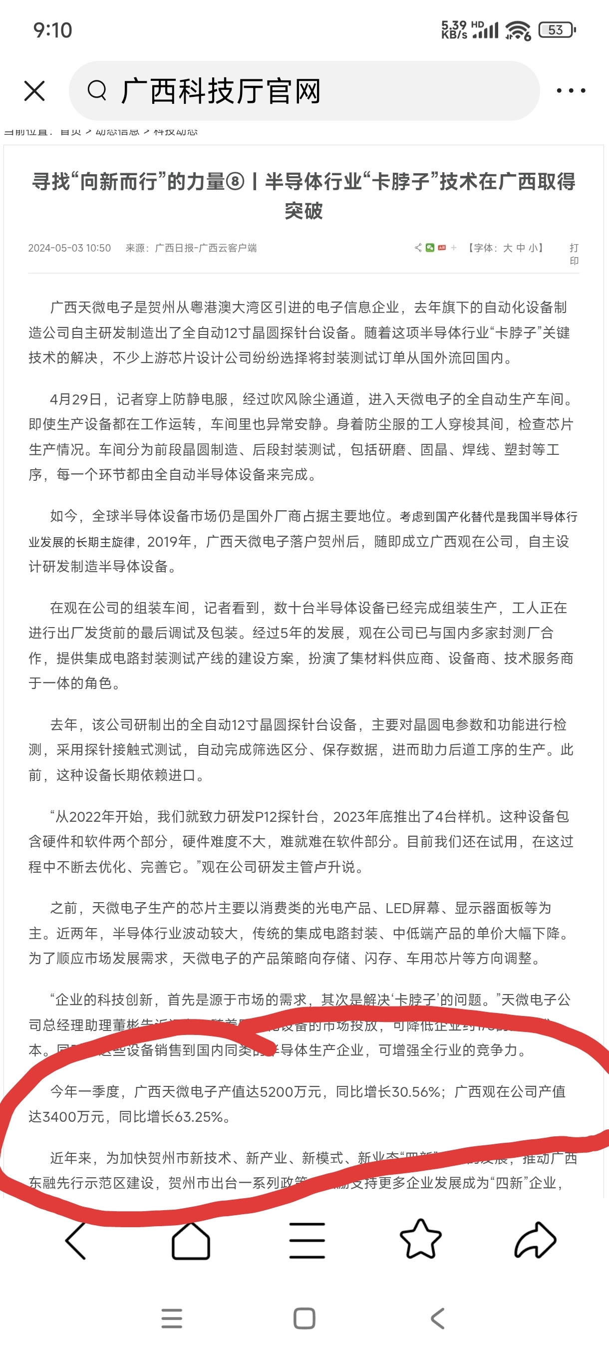 2024年一季度,广西天微电子产值达5200万元,同比增长30.56%;广西观在公司产值达3400万元,同比增长63.25%