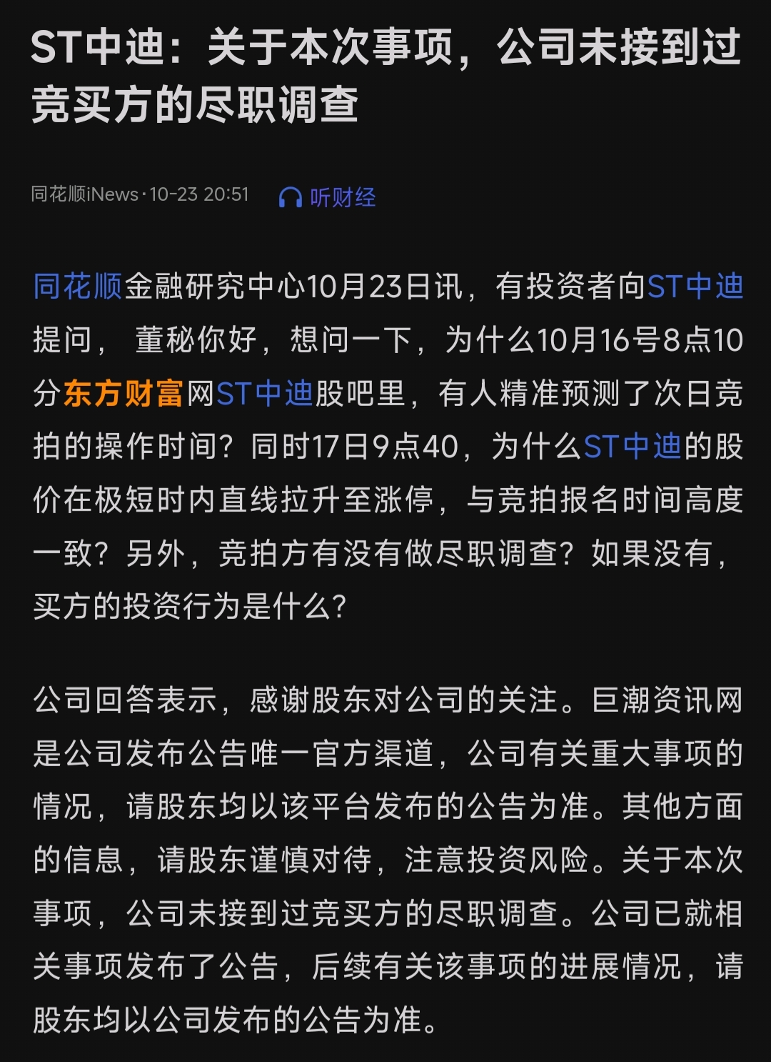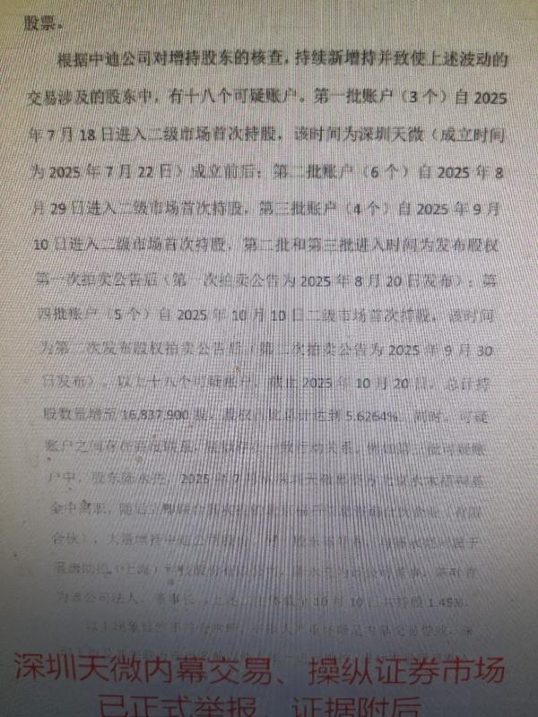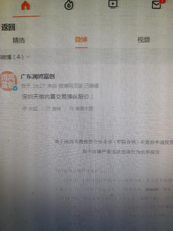 $ST中迪(SZ000609)$ $ST中迪(000609)$ 暴雷了!深圳天微,在拍卖前利用老鼠仓账户分批提前买入,在拍卖当天直接封涨停。操控市场价格,已经被相关部门举报了。公司公告未尽到调查责任,而公司要是被深交所实锤,交易取消。立案调查,等着吃一字板跌停下去吧。这就是尾款迟迟没有交付的原因。一群散户准备吃10个一字板跌停下去。