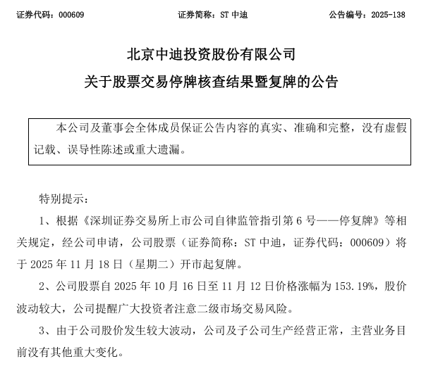 ST中迪(000609)11月17日晚间公告,根据《深圳证券交易所上市公司自律监管指引第6号——停复牌》等相关规定,经公司申请,公司股票将于2025 年11月18日(星期二)开市起复牌。