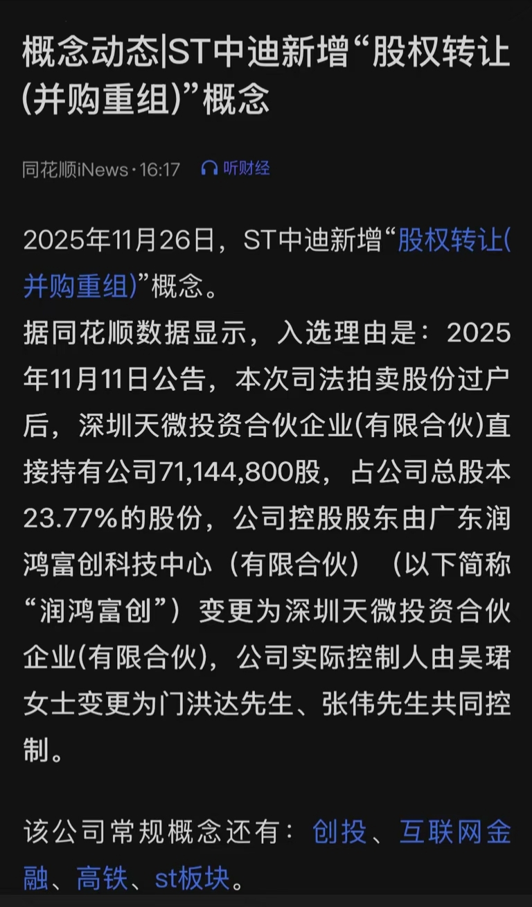 2025年11月26日,ST中迪新增“股权转让(并购重组)概念。资来源公共平台网
