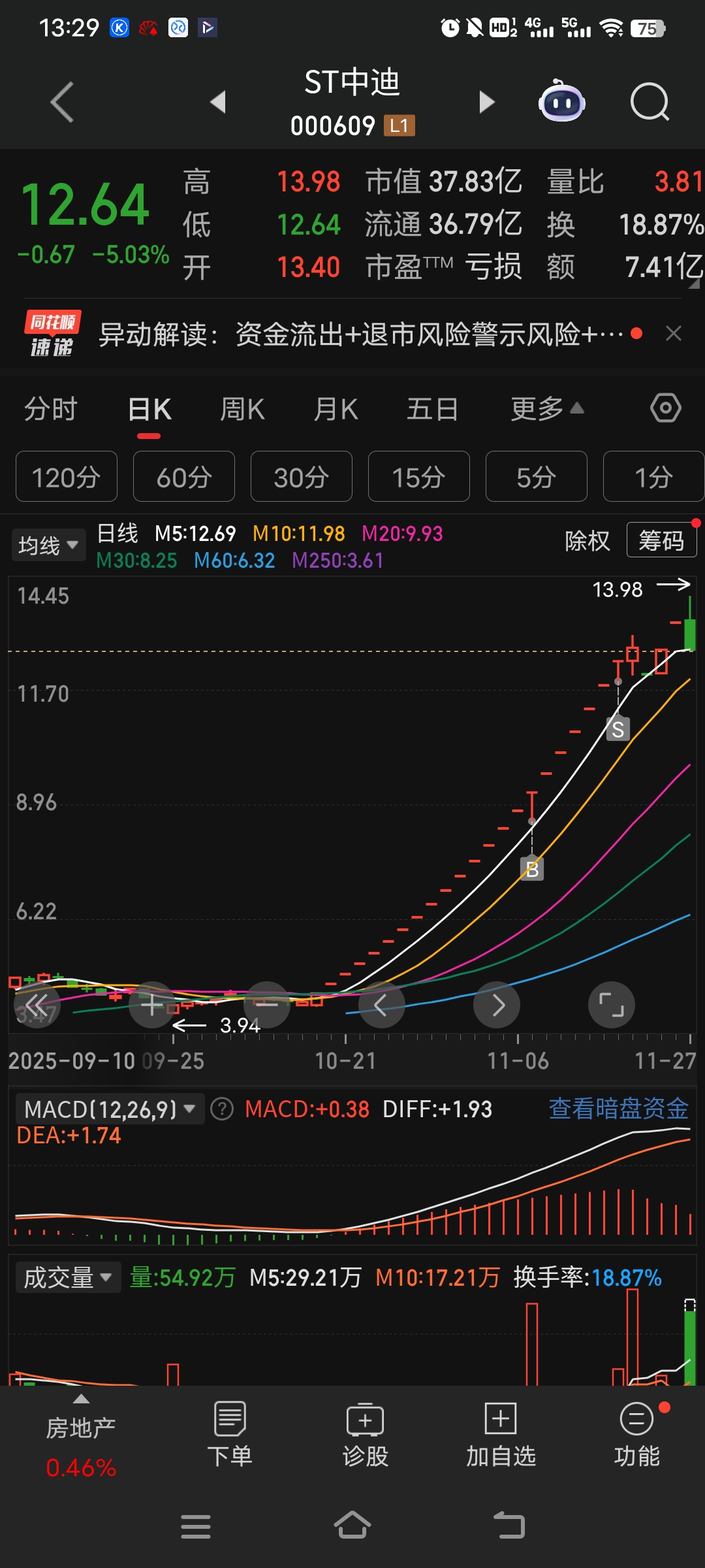12.4清仓了,赚了不到四十个点。吸取了东易的教训,当时东易在跌停板中,跑也跑不出来。今天的下跌才是刚刚开始,中迪的泡沫远远大于东易,即使半导体借壳或者注入时间尚早。年底下保存胜利果实吧