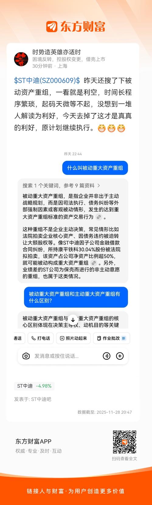 $ST中迪(SZ000609)$ 昨天还搜了下被动资产重组,一看就是利空,时间长程序繁琐,起码天微等不起,没想到一堆人解读为利好,今天去掉了这才是真真的利好,原计划继续执行。