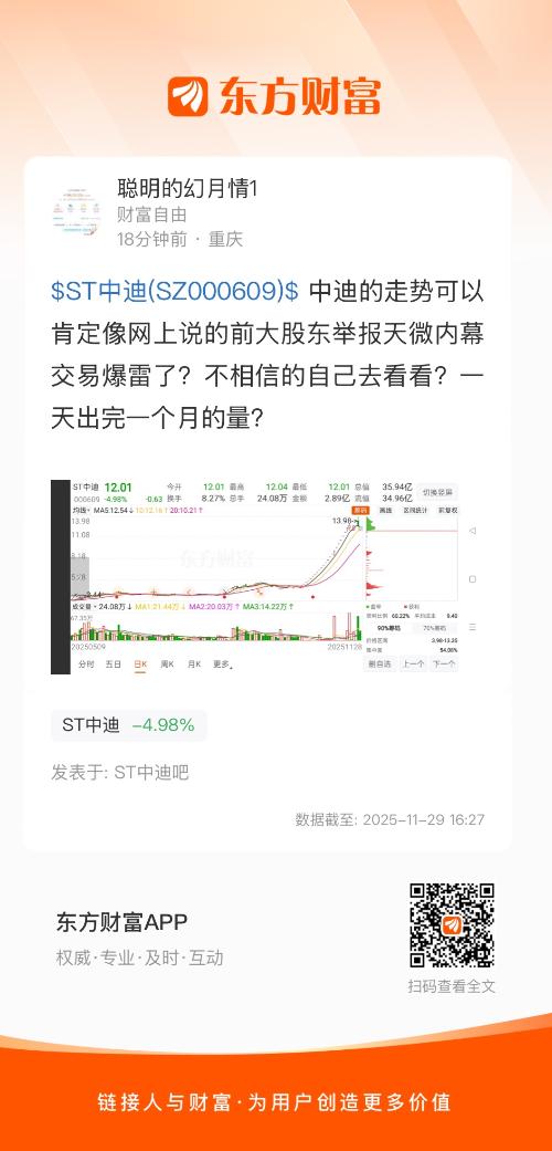 $ST中迪(SZ000609)$ 中迪的走势可以肯定像网上说的前大股东举报天微内幕交易爆雷了?不相信的自己去看看?一天出完一个月的量?