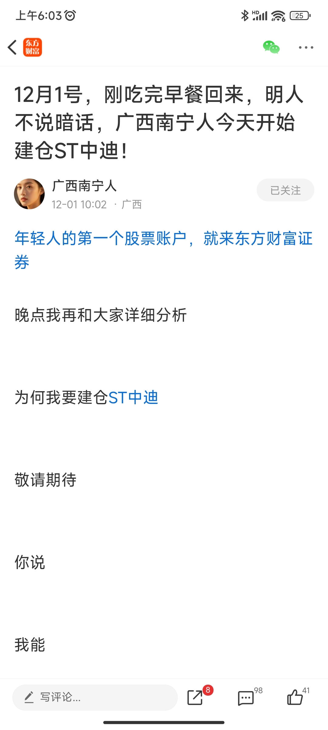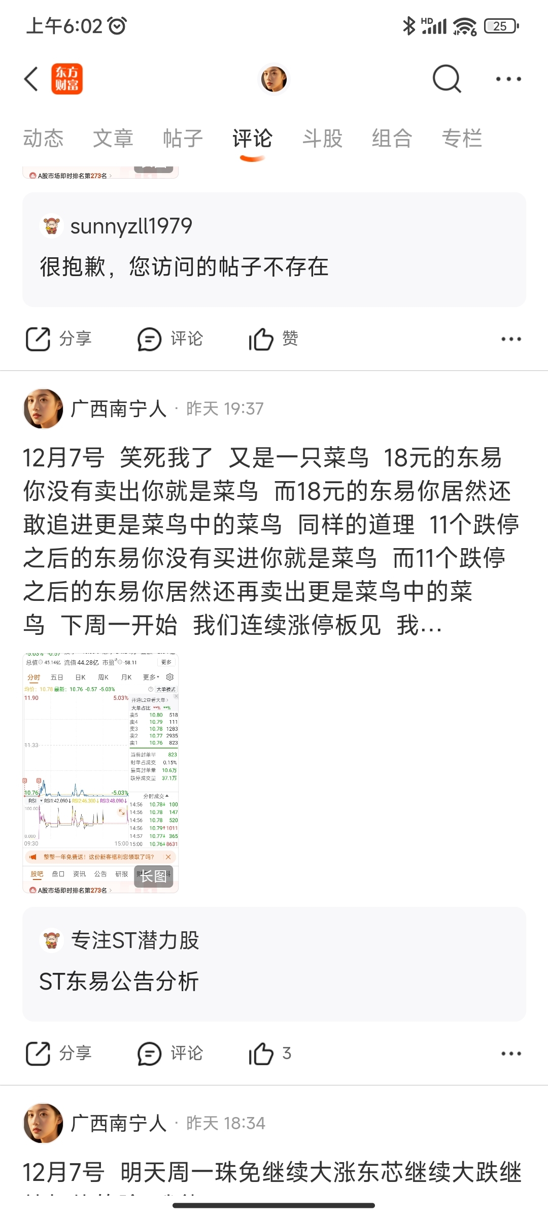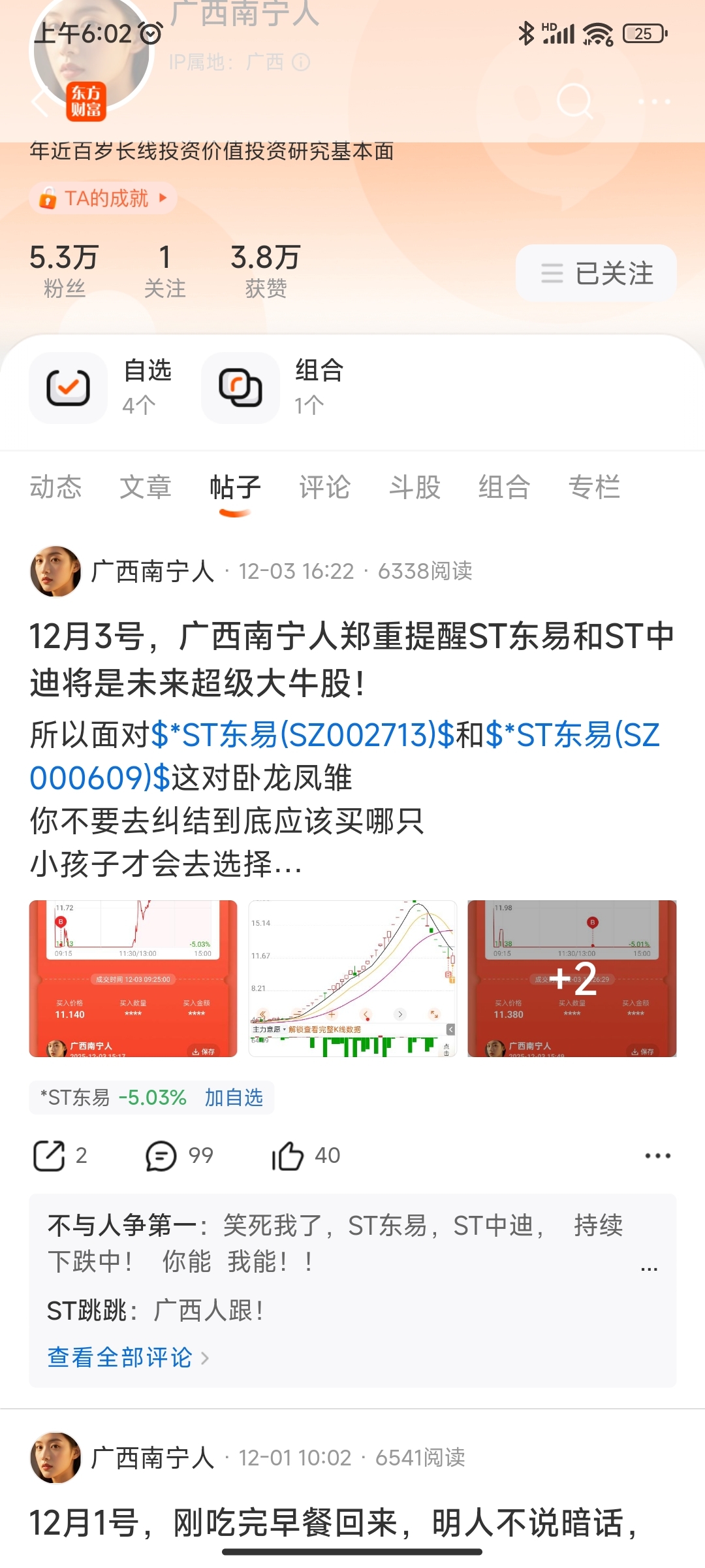 $ST中迪(SZ000609)$ $*ST东易(SZ002713)$ 这个广西南宁人,之前就疯狂唱多天茂,结果天茂退市。平时就和个精神并似的,天天什么你说,我能,感觉这个人脑子有点不太正常。现在12月1号又在唱多东易、中迪了,上周五个交易日还没亏成狗吗 广西佬水平很菜啊,精神也不大正常