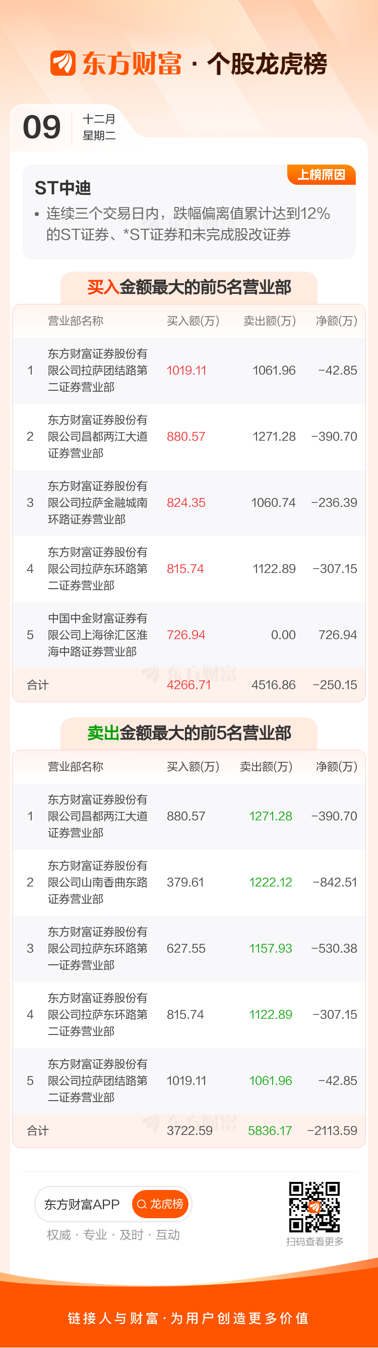 交易所2025年12月9日公布的交易公开信息显示,ST中迪因成为连续三个交易日内,跌幅偏离值累计达到12%的ST证券、*ST证券和未完成股改证券上榜。ST中迪当日收报9.9元,涨跌幅-4.99%,换手率5.50%,成交额1.60亿。异常期间12月5日至12月9日,期间涨幅-11.53%,累计偏离值-13.48%,区间成交额6.08亿。