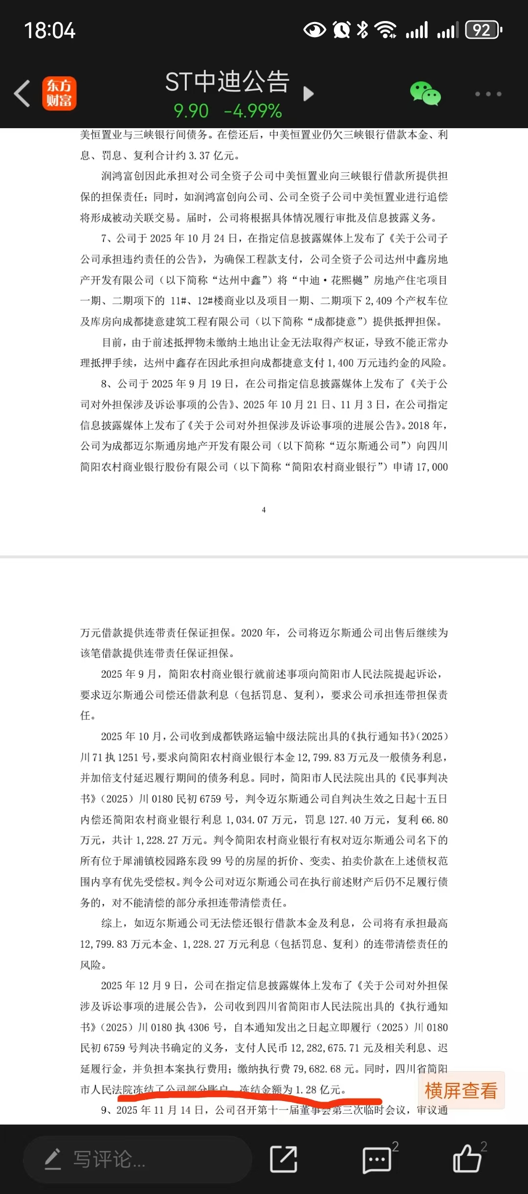 $ST中迪(SZ000609)$ 看这个确实是冻结了1.28亿