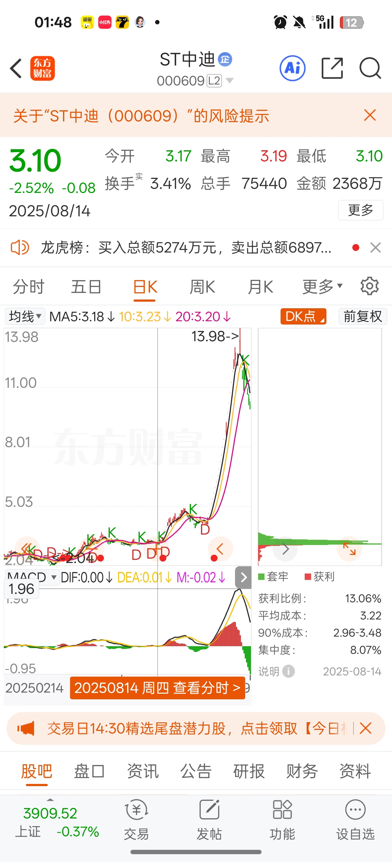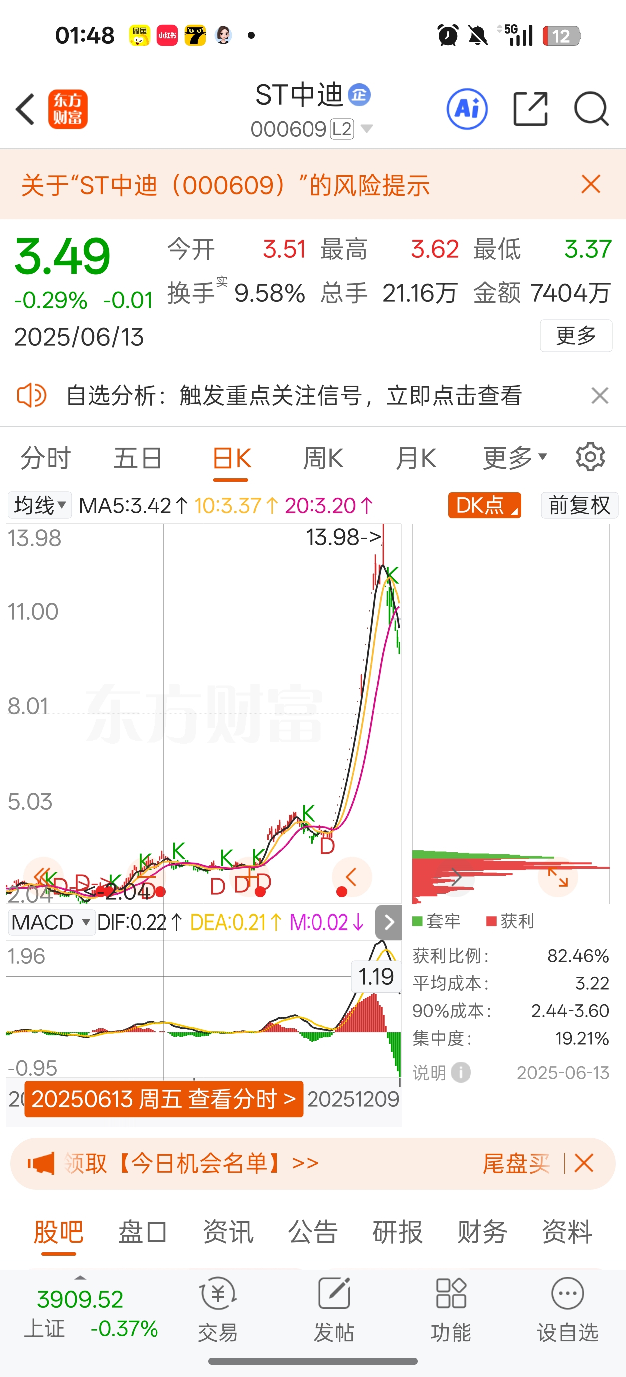 $ST中迪(SZ000609)$ 明天跑光,后面看戏,听说里面是凶狠的达州帮,那么在明年冲20+股价前,我要搬个小板凳看看它究竟如何表演它的凶狠。高标洗盘好套路——波浪向下,配合中迪之前几亿市值还要阴跌不断的套路,洗个3-4个月绝对效果很好!现在的中迪,说实话股价9块5绝对是屈才,相当于它之前的3块5,性价比很高,但我选择跑路!