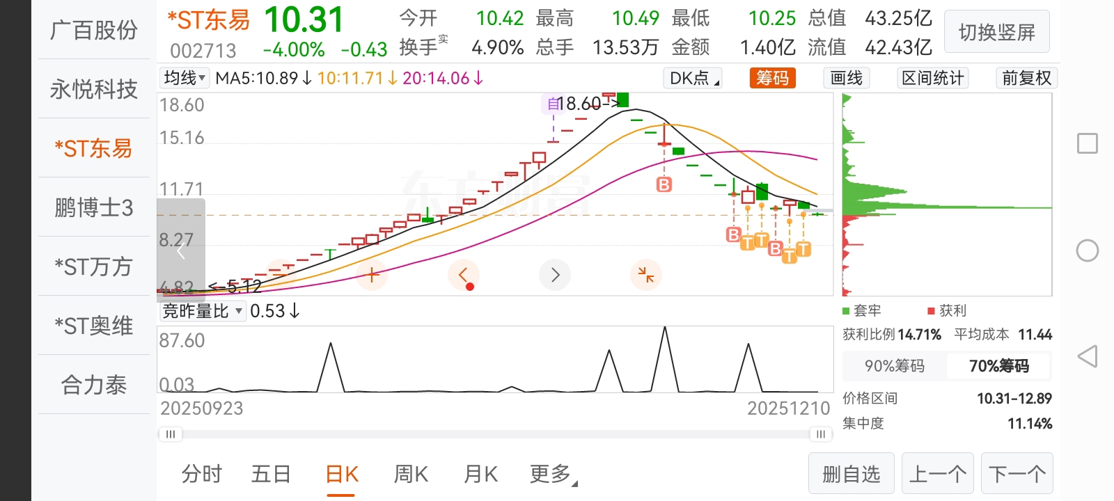 $ST中迪(SZ000609)$ $*ST返利(SH600228)$ $*ST正平(SH603843)$ $*ST东易(SZ002713)$ 抄底东易我吃了十一个跌停板才跑,东易一战,账户腰斩!吃过三次地天地板了!再也不敢抄底正平了!东易之前两次大单撬开跌停板拉高后收盘又回封跌停板!!!