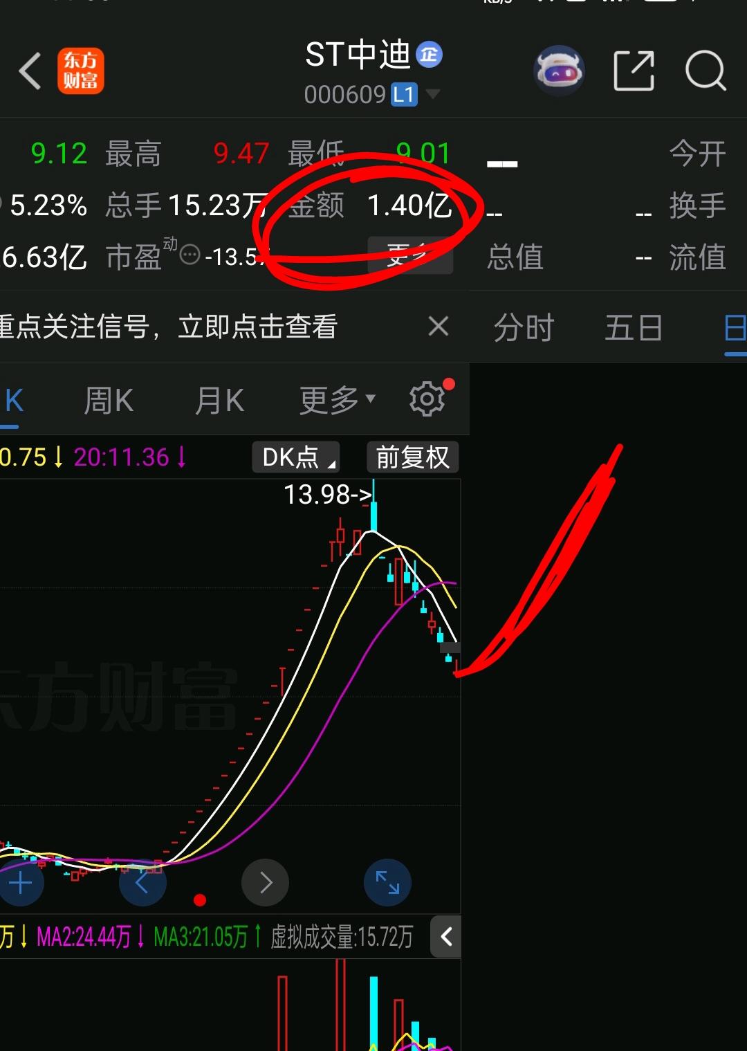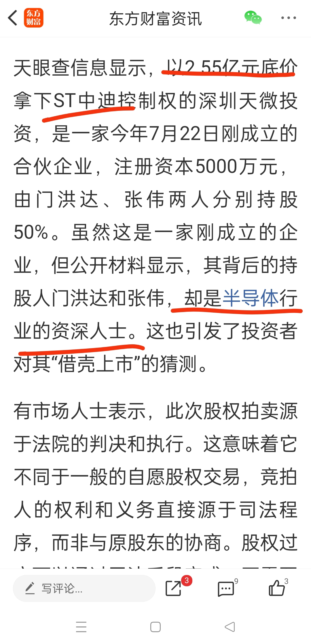 智元机器人借壳上纬新材500亿,15倍,中昊芯英借壳天普股份200亿,10倍,天微电子借壳中迪股份,股价在还在山脚下,缩量1.5个亿了,好久没画了,画个图,99%正确。。缩量1.5个亿不跌停,还会来一波。流通盘比ST东易,小一半,成交量缩量1.5亿更小,反弹起来比那个会更猛。。拭目以待,半导体借壳。