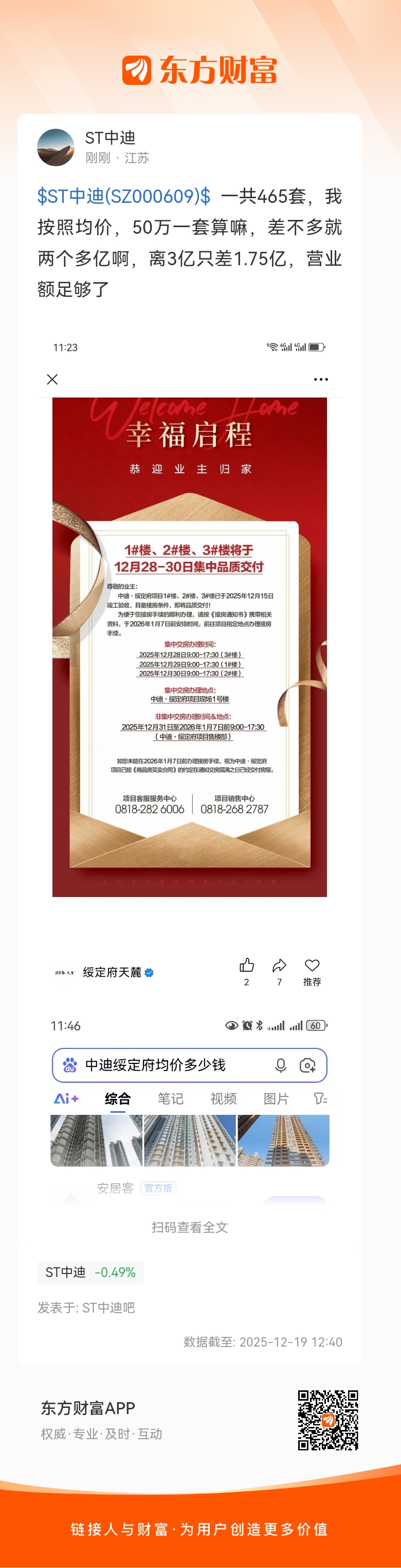 早就己经90%多都卖了,钱也收了,在资产负债表合同负债2.3亿上面,现在会计上只不过采取交钥匙房才确认收入,3亿收入稳了$ST中迪(SZ000609)$$天普股份(SH605255)$$平潭发展(SZ000592)$