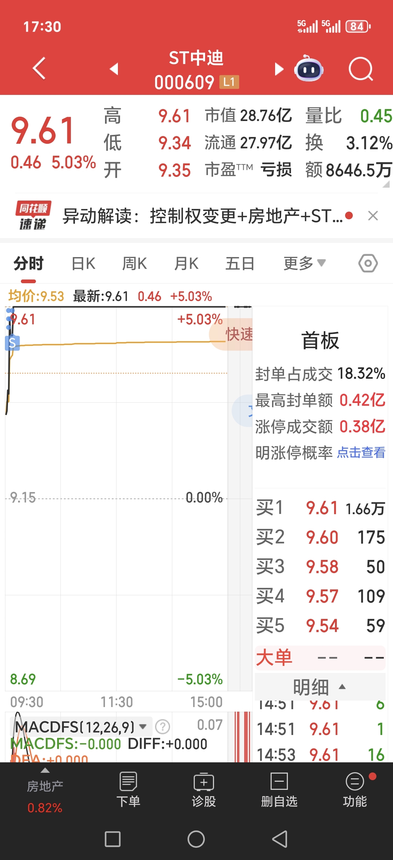 $ST中迪(SZ000609)$ 今天T飞了,明天顶板看看能不能买进来吧