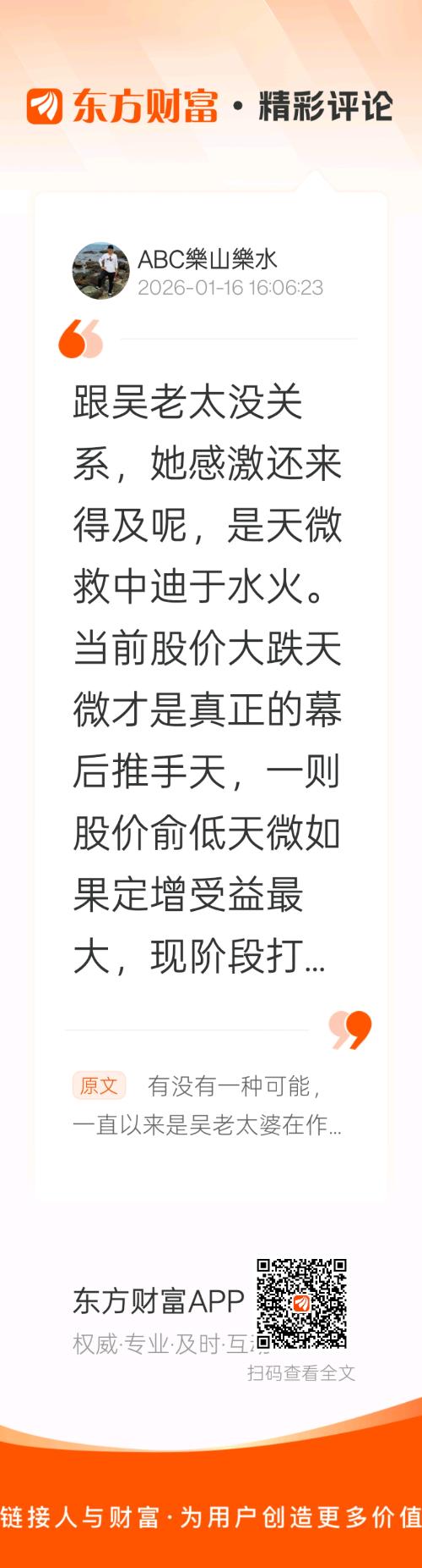 //@ABC乐山乐水 :跟吴老太没关系,她感激还来得及呢,是天微救中迪于水火。当前股价大跌天微才是真正的幕后推手天,一则股价俞低天微如果定增受益最大,现阶段打压股价是最好的时机,主力也极力配合;其二,天微有很多资本集团的关系,自身处于深圳资本发达的核心,难免与有一些资本有这样或那样的利益关系,让这些关系群得一点好处理所当然,他们的利从何来?当然是打股价打到合适的区域,收获低廉筹码从中获利。我一直存在着这样的判断,迪友们也可以仔细分析一下有无这种可能。所以,9元附近我只加不减,因为这种概念的票一个利好出来,散户很难入场,而且什么时候出利好很难判断,趟平卧倒成为我不二选择。目前基本上全仓中迪,成本9.5元附近,但我觉得被套也是正常的,解套盈利也是存在的。对个股的分析判断仁者见仁智者见智,我不认为自己的观点完全正确,也不认为不符合一定逻辑关系。股价跌到这个位置,观点分歧比较大,对错难做定论,只有走出来才是最为真实的正确答案。眼下只有根有据自己的认知做出理性正确的选择!