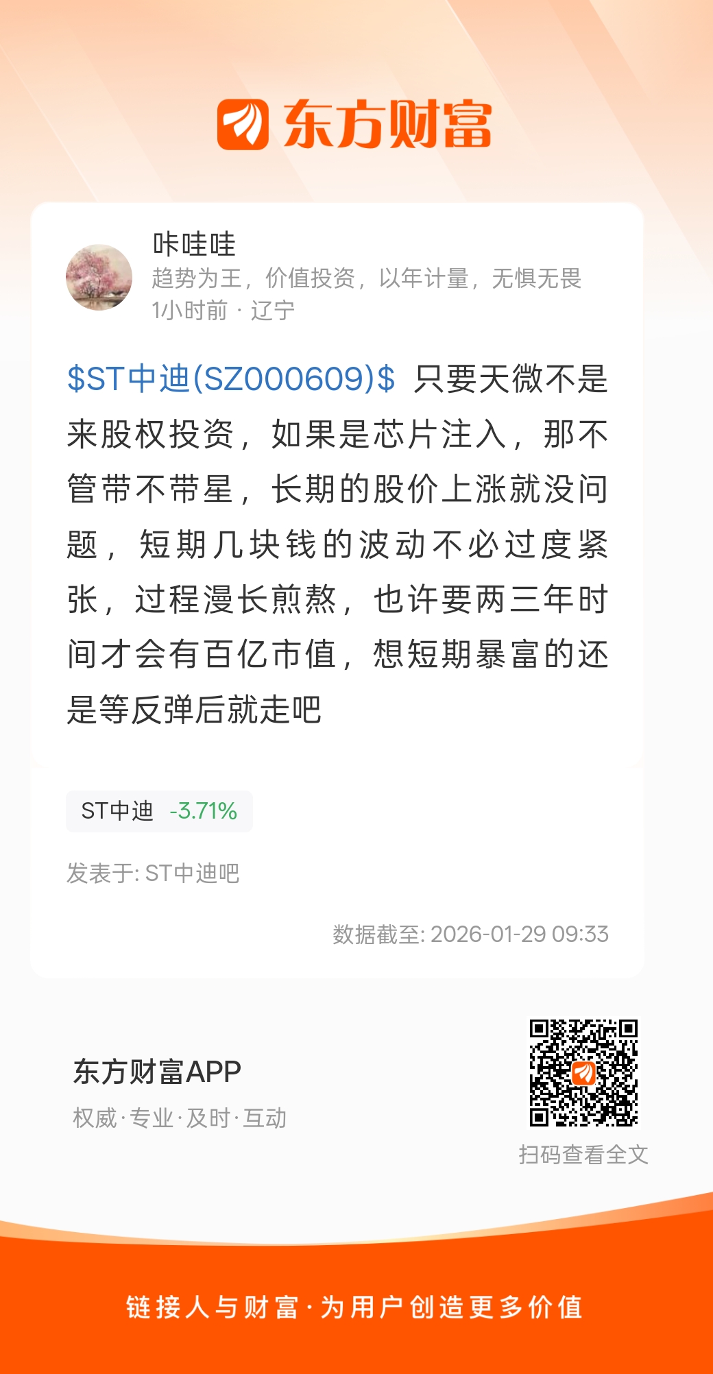 $ST中迪(SZ000609)$ 只要天微不是来股权投资,如果是芯片注入,那不管带不带星,长期的股价上涨就没问题,短期几块钱的波动不必过度紧张,过程漫长煎熬,也许要两三年时间才会有百亿市值,想短期暴富的还是等反弹后就走吧