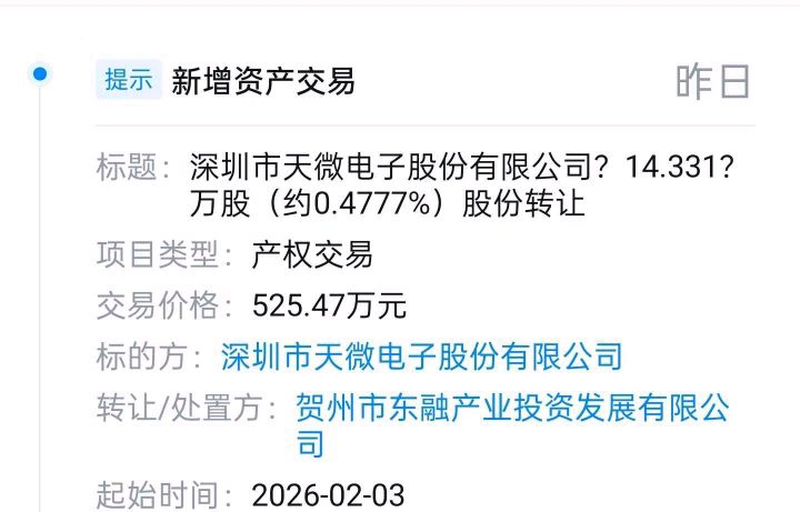 这是它3号的一次股权转让,可以大致算出深圳天微电子股份有限公司在一级市场的估值是11亿。