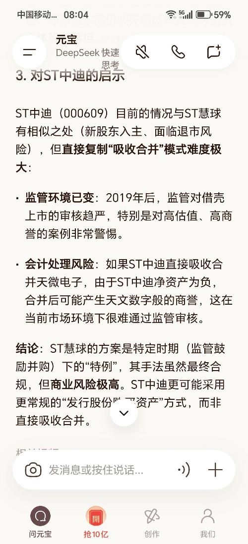$ST中迪(SZ000609)$ 年报前新的董事会应该到位了吧,否则年报无人签字了,每个公司都有不同的情况,中迪今年不重组还有第二条路可走吗,这个货已经无法再混下去了,本人坚持认为吸收合并深圳天微的可能性比较大。