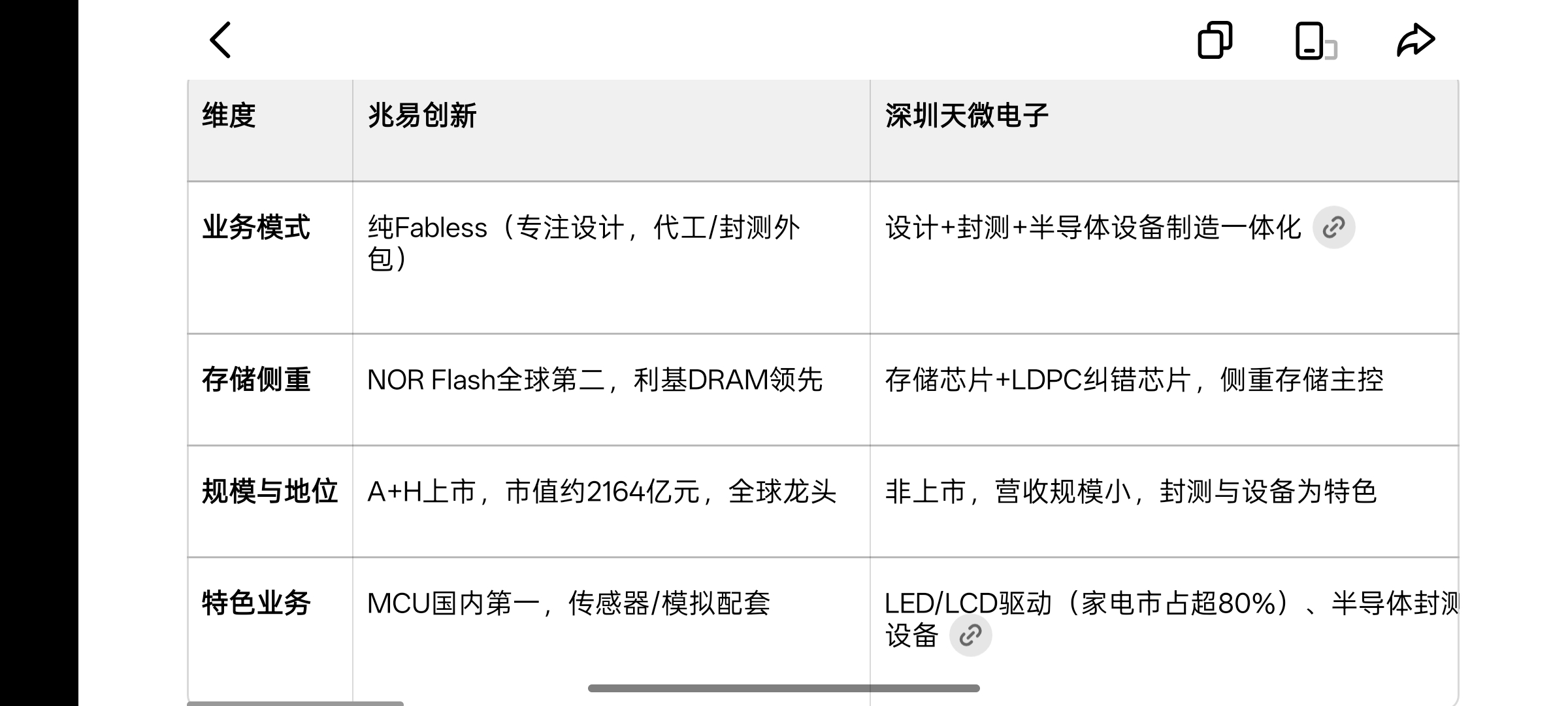 两者是同赛道、同产品方向、同应用市场的国产芯片企业,均卡位存储与控制芯片的国产替代机遇;核心差异在于兆易创新是纯设计龙头,深圳天微电子则是设计+封测+设备的一体化区域专精特新企业。